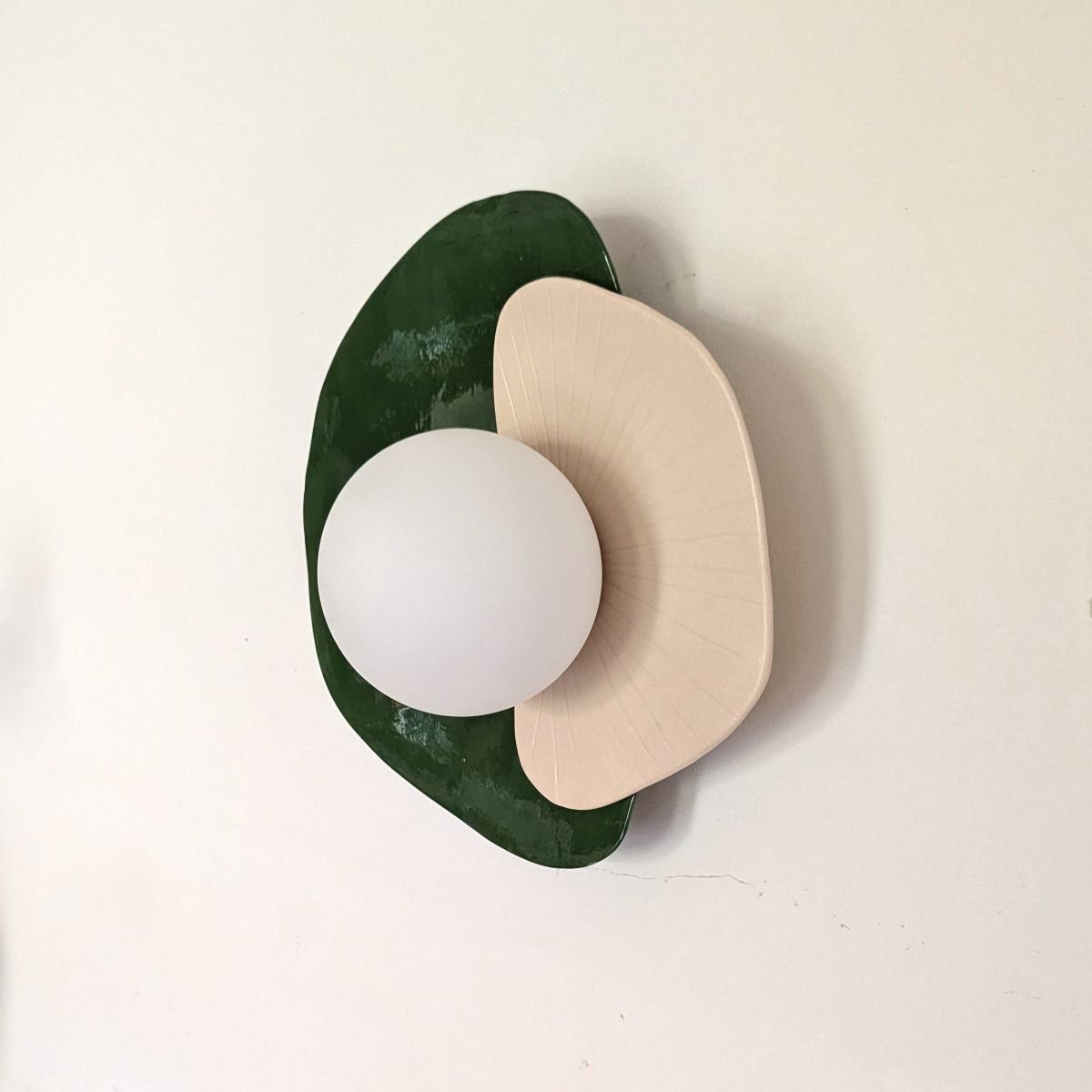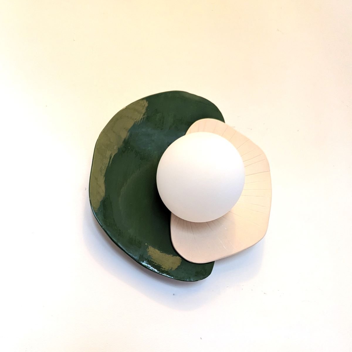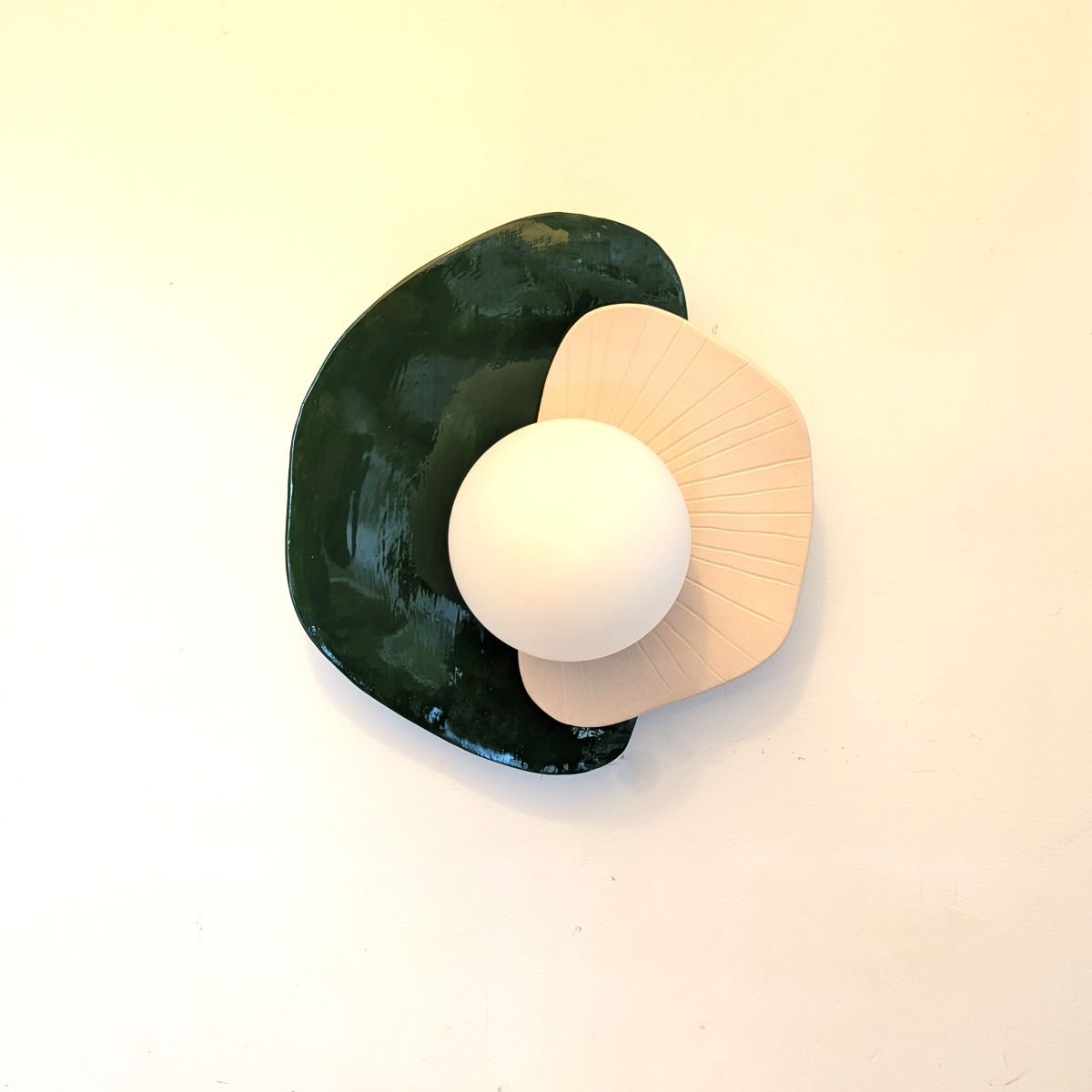 Applique fabriquée à la main en faïence blanche. Décor email transparent mat d’un côté et vert foncé de l’autre.