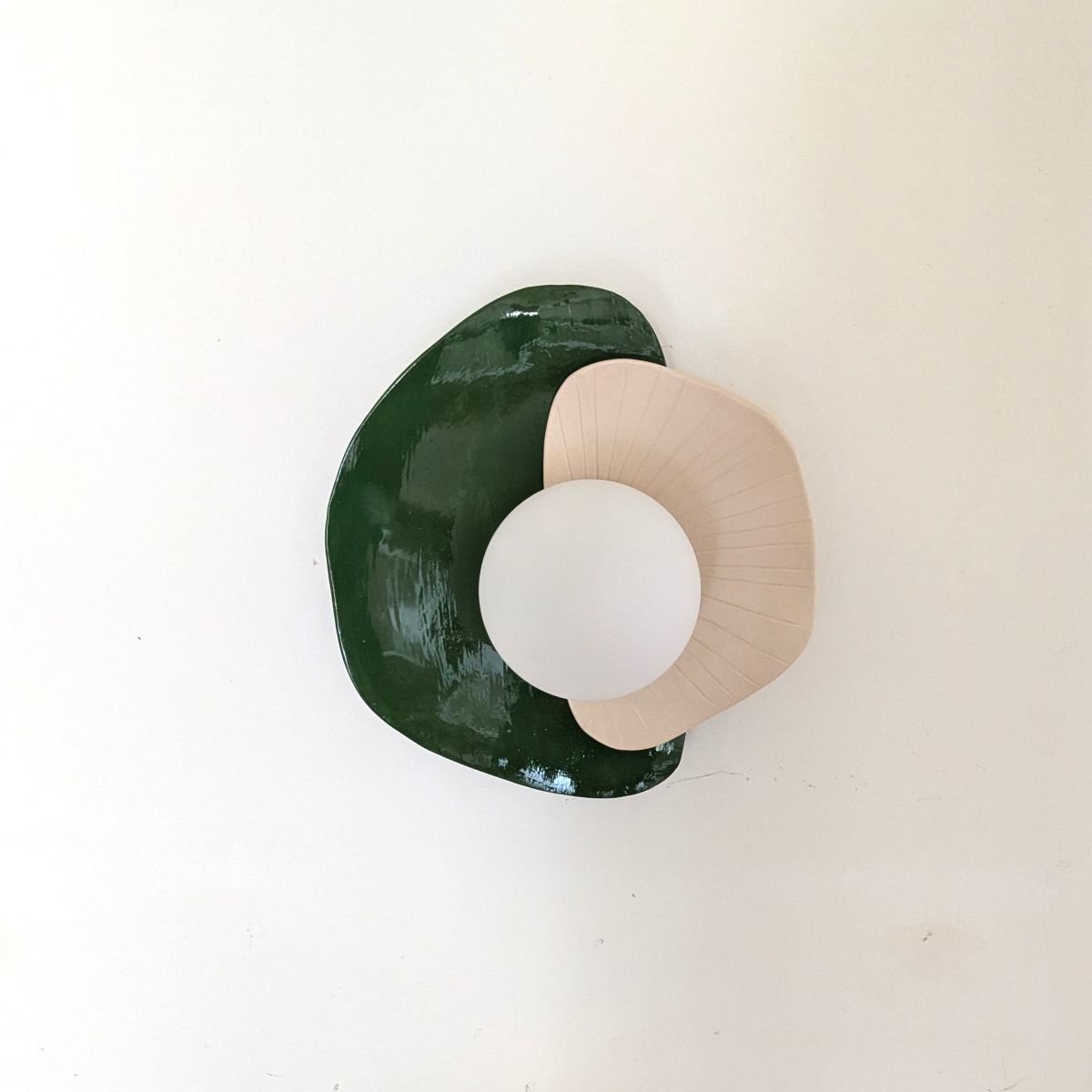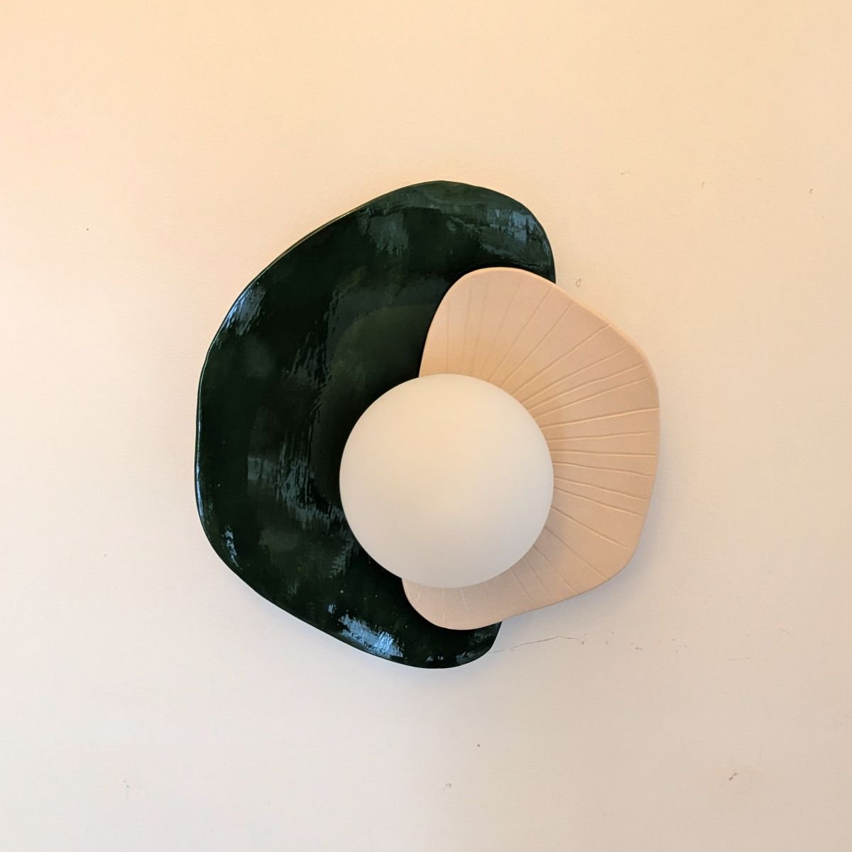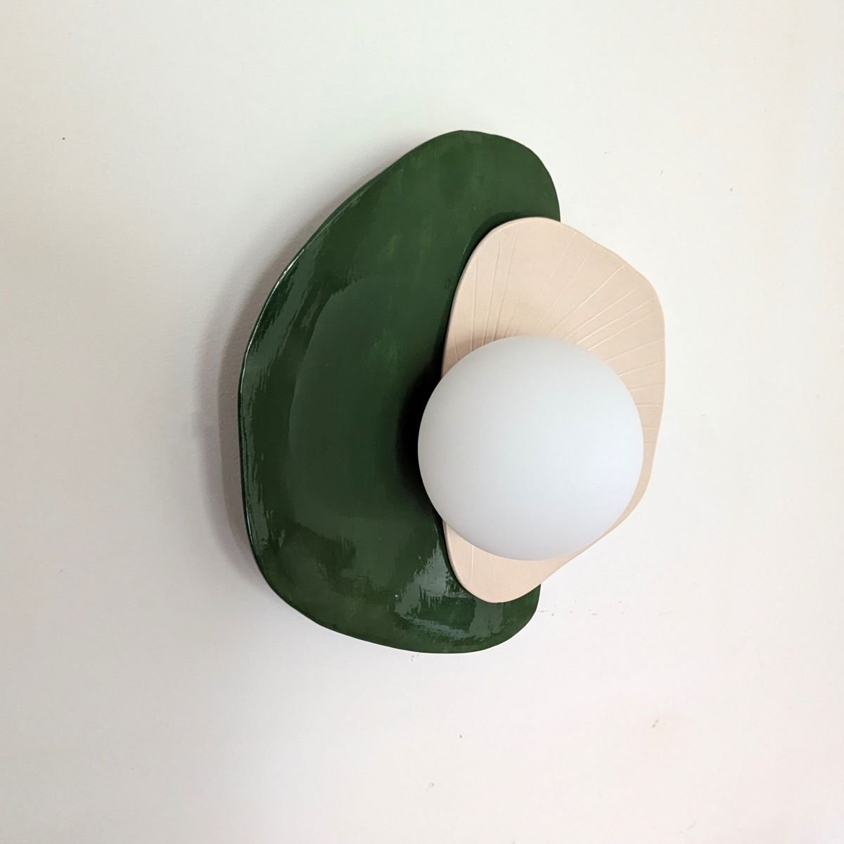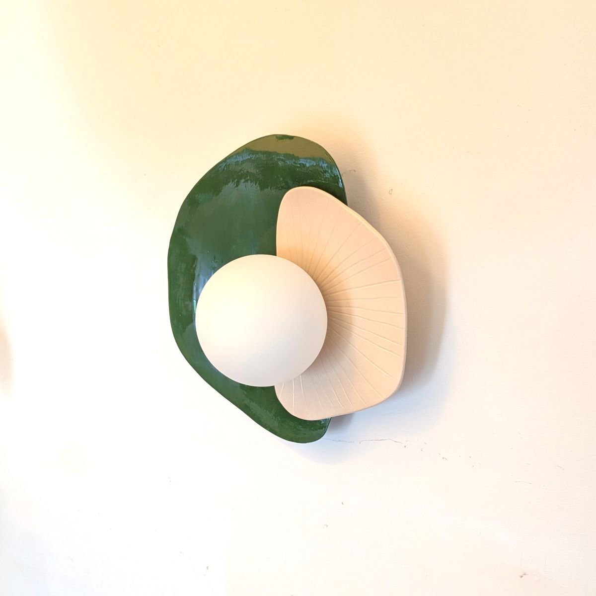 Applique fabriquée à la main en faïence blanche. Décor email transparent mat d’un côté et vert foncé de l’autre.