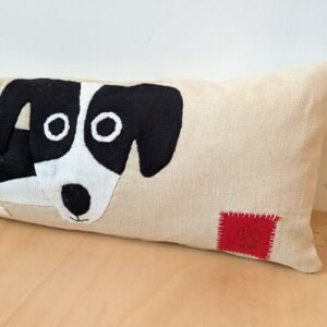 Coussin en lin illustré d’un chien en appliqué. Fabriqué à la main