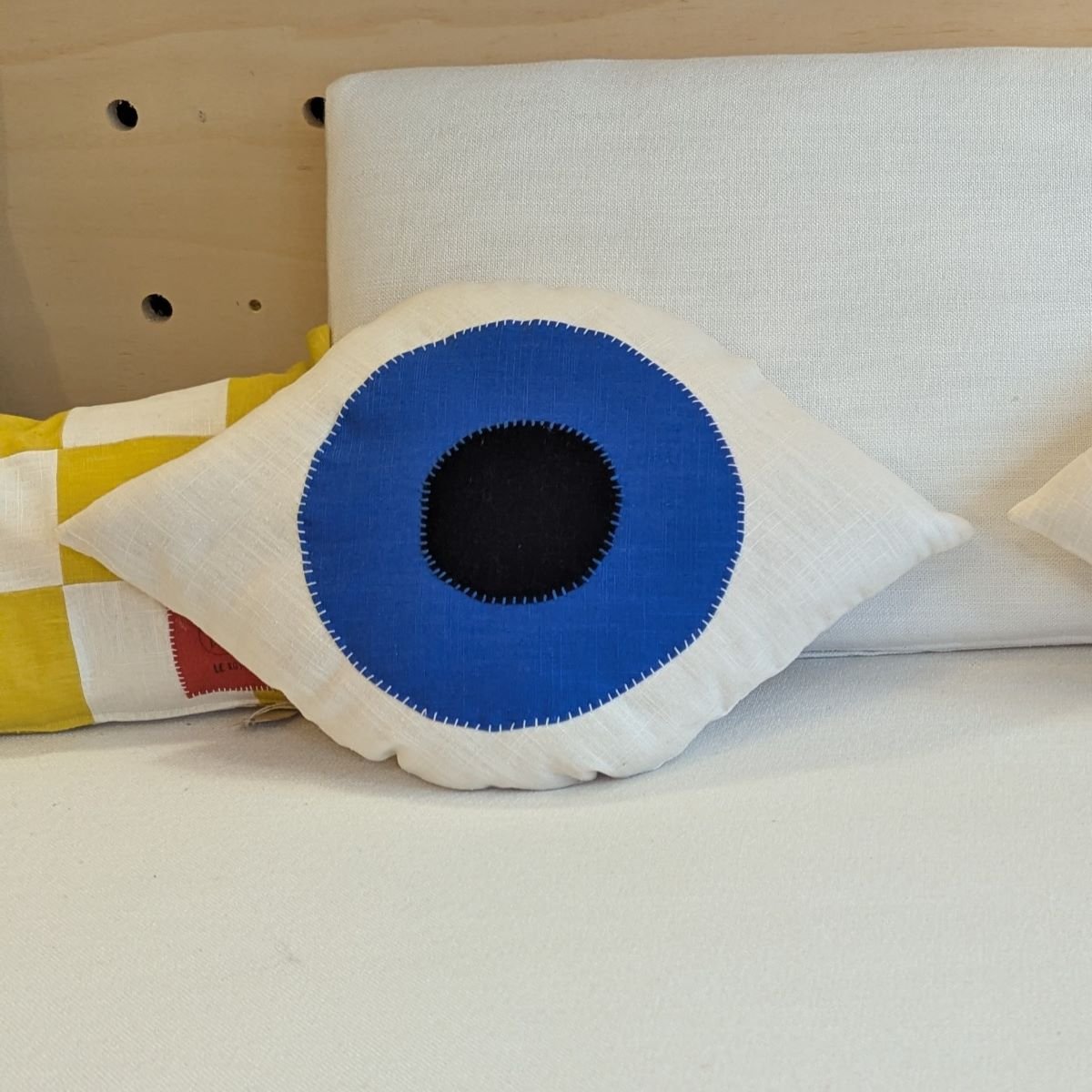 Coussin en lin illustré d’un oeil en appliqué. Fabriqué à la main