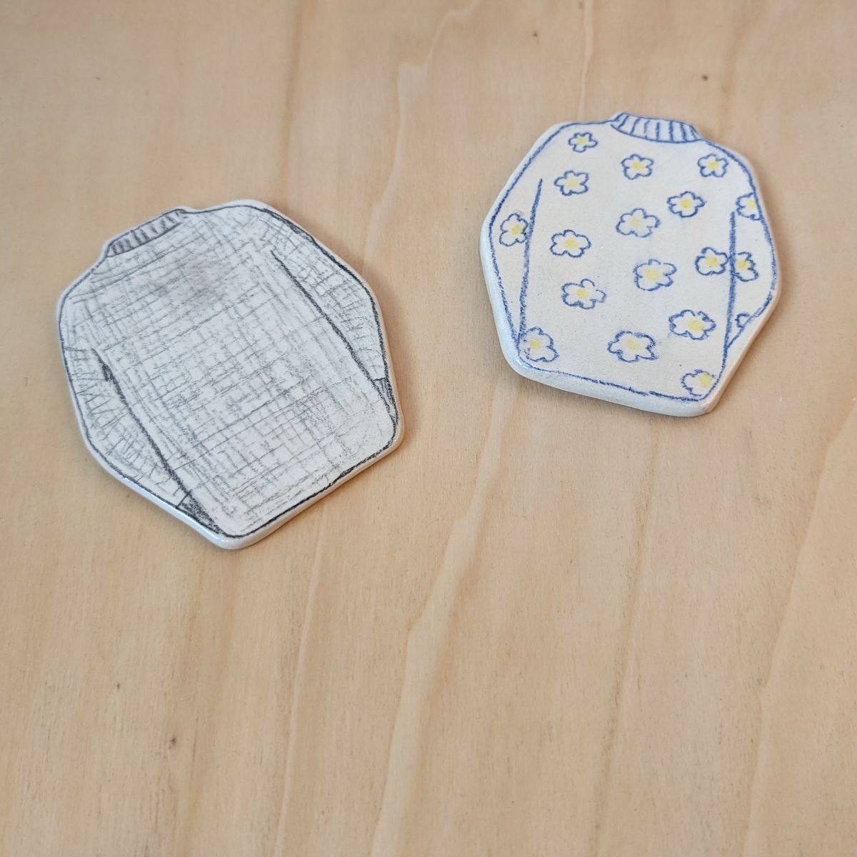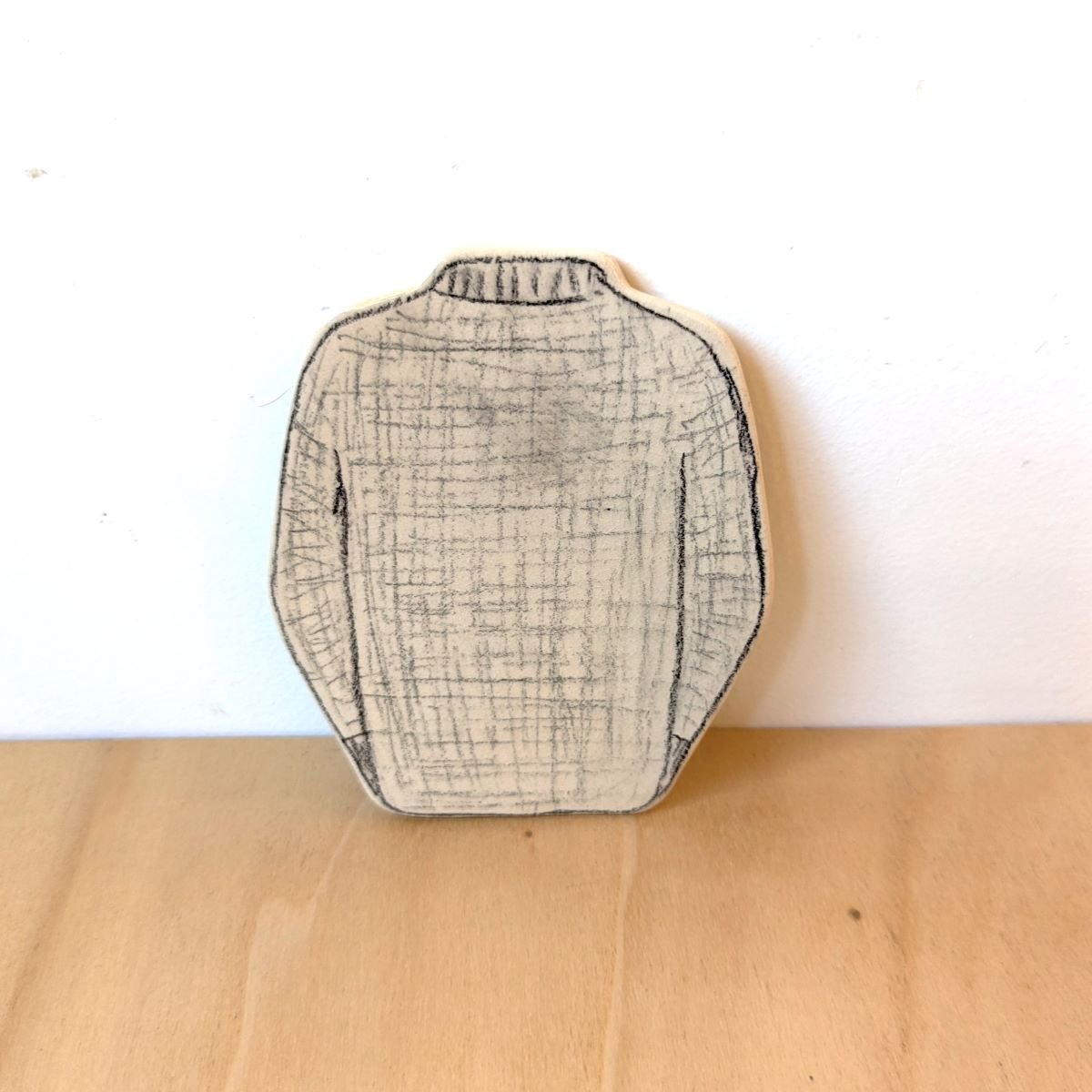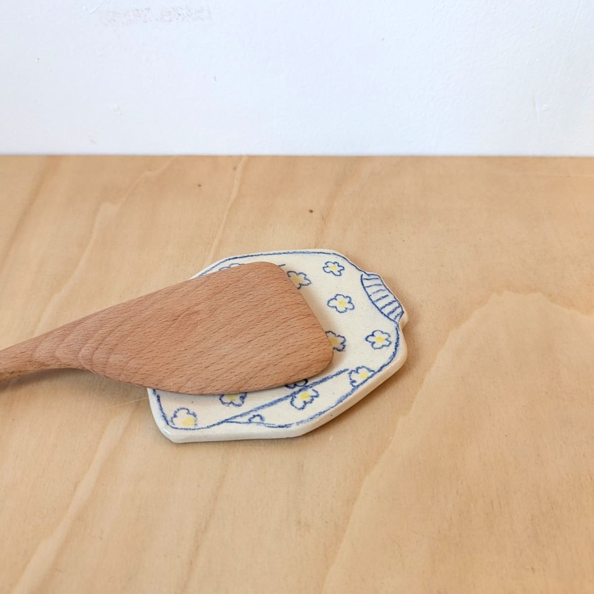 Repose spatule fabriqué à la main en faïence blanche. Décor au crayon à oxyde et email transparent.